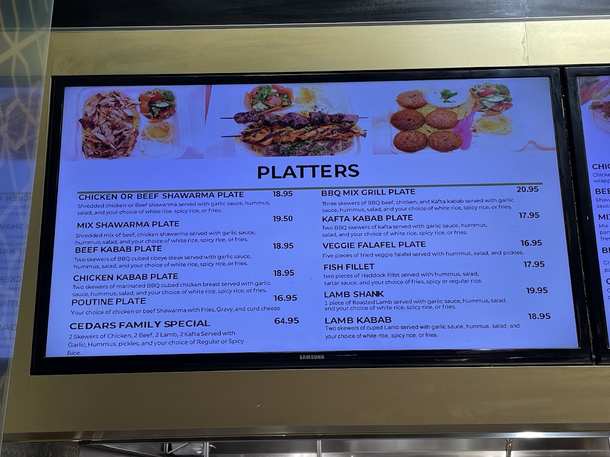 - Platters: Choose from options like the Beef Kabab Plate or the hearty Cedars Family Special for a taste of home-cooked goodness.